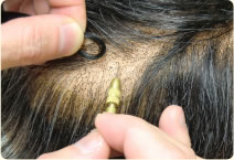 自然な髪型に見えるかつらは頭の形にぴったりとフィットしています。型取りで生え際やつむじの位置、髪の流れも確認。より自然なかつらが生まれます。 |